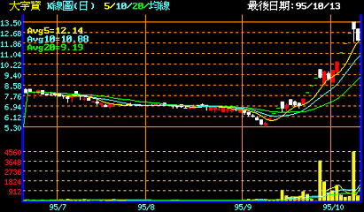 好幾次的漲停板,讓大宇資十月十二日甚至收在十三塊的價位,整整漲了一倍有餘。