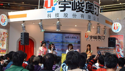 宇峻奧汀攤位以《UJ熱血學園》為主題,將攤位佈置成教室,玩家則在課桌前試玩遊戲,
