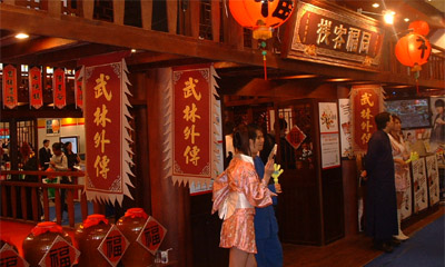 還特別把攤位佈置成遊戲中的場景同福客棧,並讓服務人員穿上古裝。